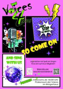 Geprobt wird immer mittwochs (außer in den Ferien) von 18:00 -19:30 Uhr im Bürgerhaus in Bolanden (Proberaum Voices).