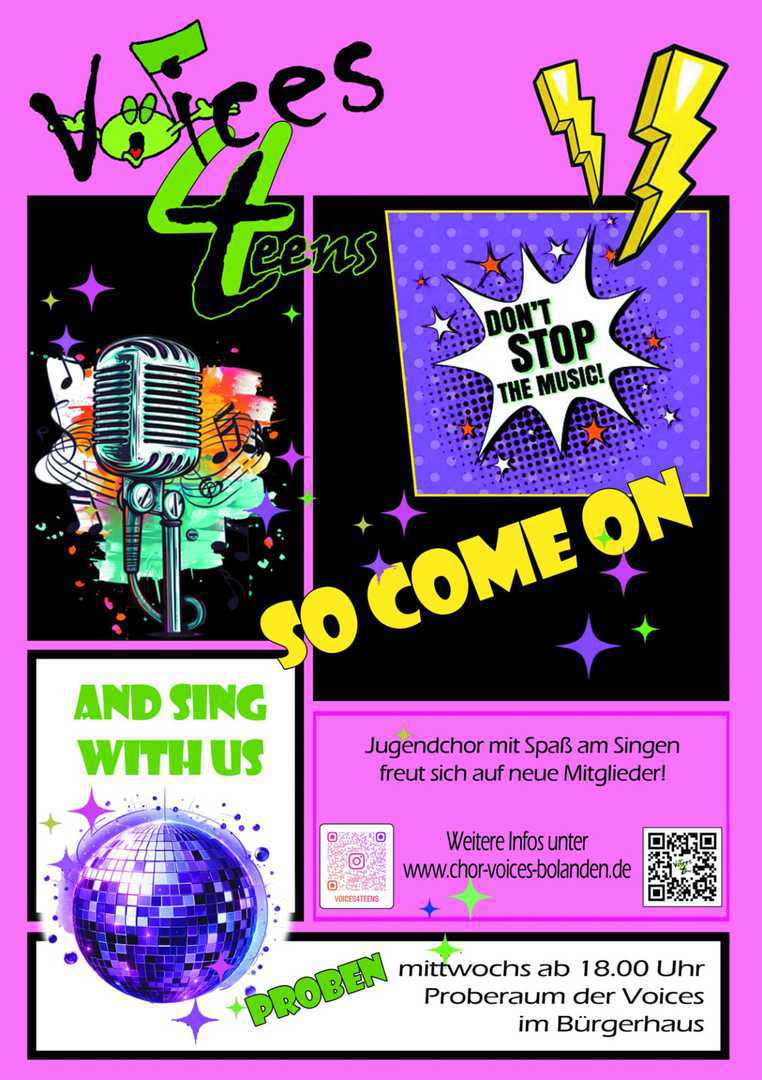 Und bei verschiedenen Gelegenheiten wie Kinderchorfestivals, Adventssingen oder beim Deutschen Chorfest geben die Teens ihre Stücke zum Besten. Darüber hinaus singen sie bei gemeinsamen Auftritten mit dem Kinderchor „Donnersberger Spatzen“ und dem Erwachsenenchor „Voices“ mit.